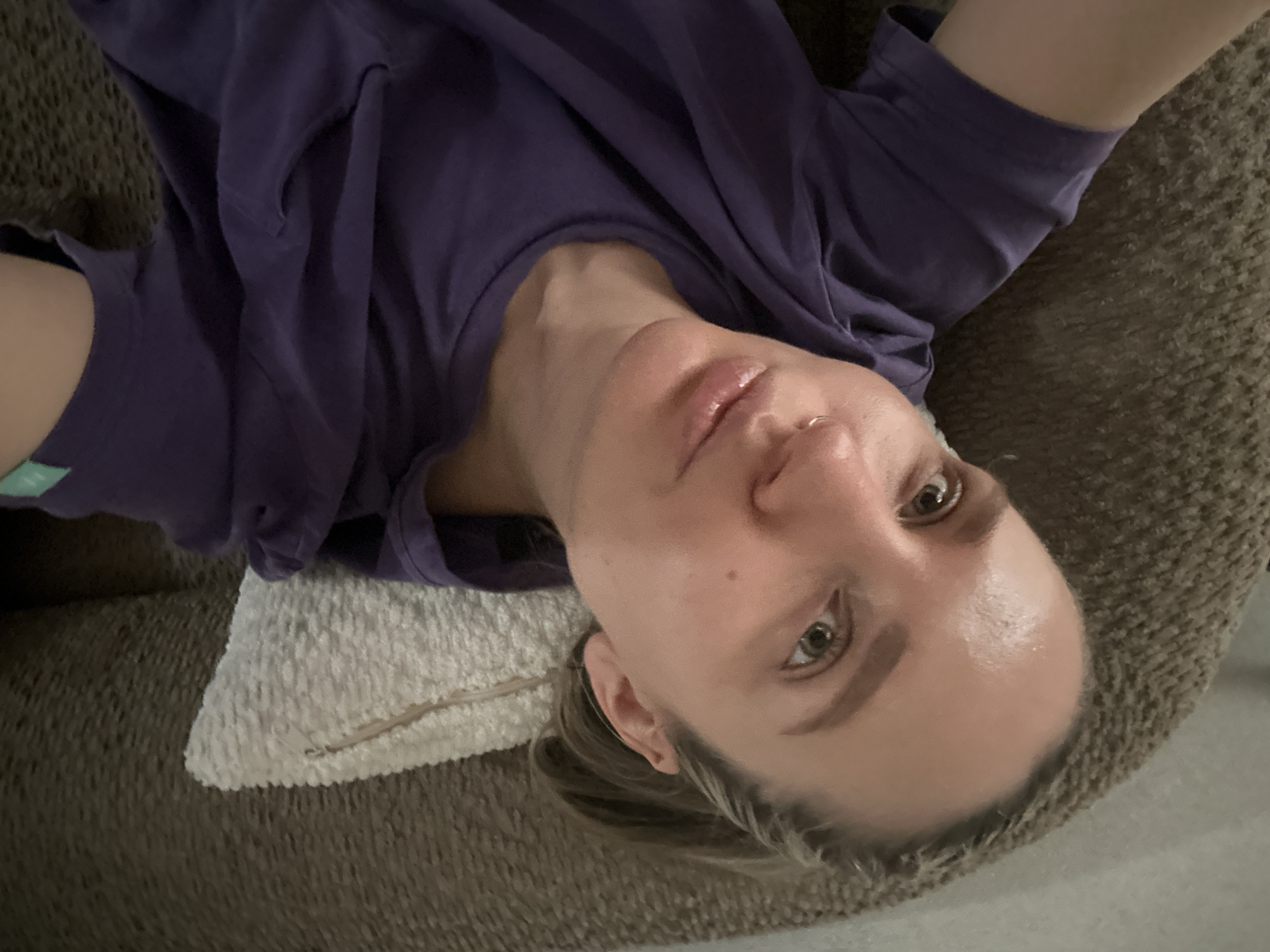 A light-skinned person lies on a brown, textured couch with a white pillow underneath their head. The person wears a purple t-shirt. The photograph appears to be taken from an above angle, and the person is looking upwards towards the camera. The location is assumed to be indoors. There is no definitive information to confirm this image was taken in Esenyurt, Turkey.