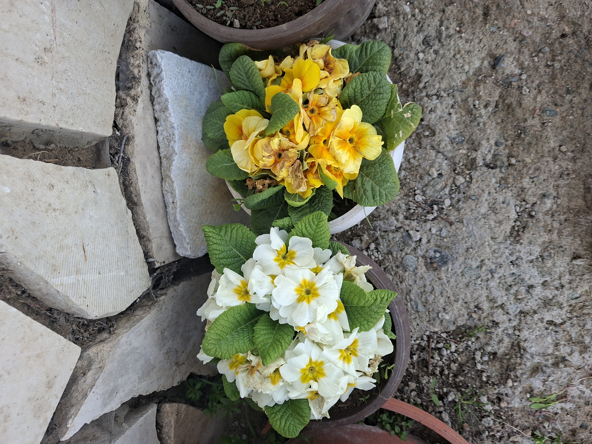 The image presents a top-down view of two potted flowering plants, situated on a paved surface, possibly in the city of Selishte, Bulgaria. One pot contains yellow primrose flowers with green leaves, some of which are withering. The other pot holds white primrose flowers with yellow centers, also surrounded by green leaves, and showing signs of age. Adjacent to the yellow flowers are fragments of light-colored stone. The surrounding pavement is textured and composed of small stones. The overall lighting is natural. No people are visible.