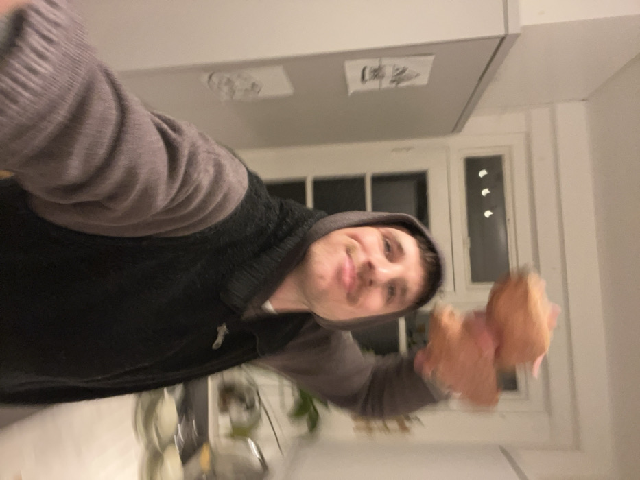 A man poses in a kitchen, holding a blurry pink stuffed animal in his right hand. He wears a grey hoodie over a black vest. White cabinets are above him with papers taped on. A white window frame is visible behind him, providing light. The photo is blurry and slightly tilted. Kitchen items can be seen on a white countertop below.