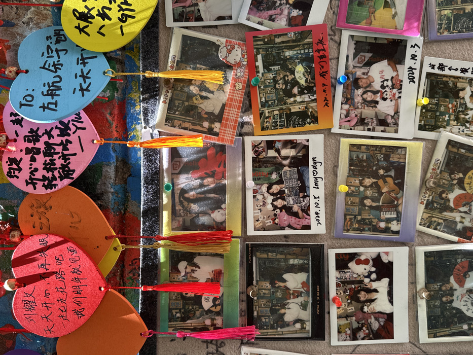 The image displays a wall adorned with numerous instant photographs and heart-shaped wooden plaques, located in Ciqikou Ancient Town, Shapingba District, Chongqing, China