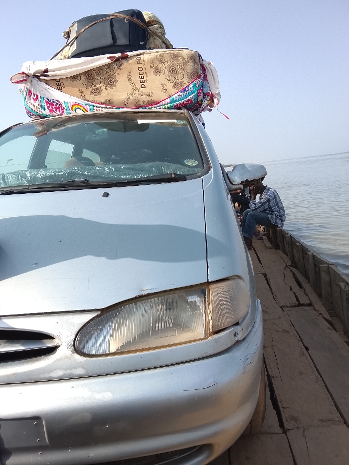 A silver passenger vehicle is depicted loaded onto a wooden ferry, indicating a river crossing in Ibi, Nigeria