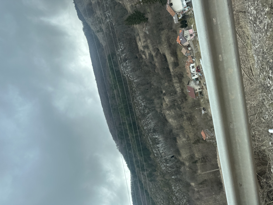 The image displays a panoramic view of a village nestled at the base of a mountainous terrain, identified as Gintsi, Bulgaria, under an overcast sky. The foreground features a silver-colored metal guardrail, indicative of a roadside barrier, positioned horizontally across the lower third of the frame. Below the guardrail, dry, sparse vegetation and bare branches are visible. The midground reveals a cluster of approximately ten residential houses within Gintsi. These structures feature varied facades (white, light pink, light brown) and predominantly pitched roofs covered with red, orange, or brown tiles. The houses are dispersed on a gentle slope, surrounded by bare deciduous trees and dry grass. Utility poles and wires are discernible near some residences. The background is dominated by a large mountain slope, heavily wooded with a mix of bare deciduous trees and patches of evergreen conifers, suggesting a late winter or early spring season. Multiple horizontal power lines or utility wires traverse the mid-section of this slope. Significant geological features include exposed, light-colored rock formations and cliff faces interspersed within the treeline. The sky above is entirely covered by a uniform layer of grey clouds, indicating an overcast day. No individuals, explicit actions, or direct interactions are visible within the scene.