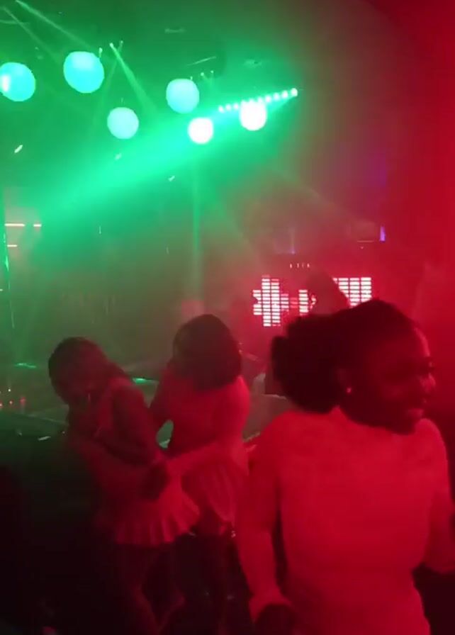 group of women dancing in a dimly lit club environment, illuminated by a combination of red, green, and blue lighting effects