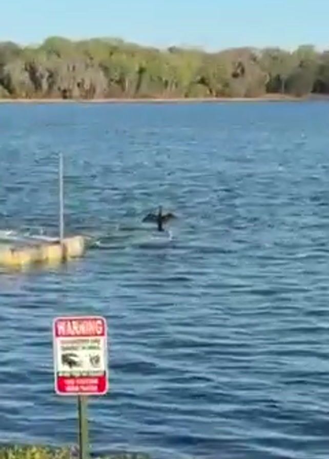 A short video shows a cormorant drying its wings on a metal handrail in a lake. The bird has dark feathers and a long neck. It stands on the handrail with its wings spread wide, as if to catch the sun. The lake water is choppy and a sign reads "WARNING Alligators and Snakes in area". A dock is visible in the background, along with trees and a clear blue sky.