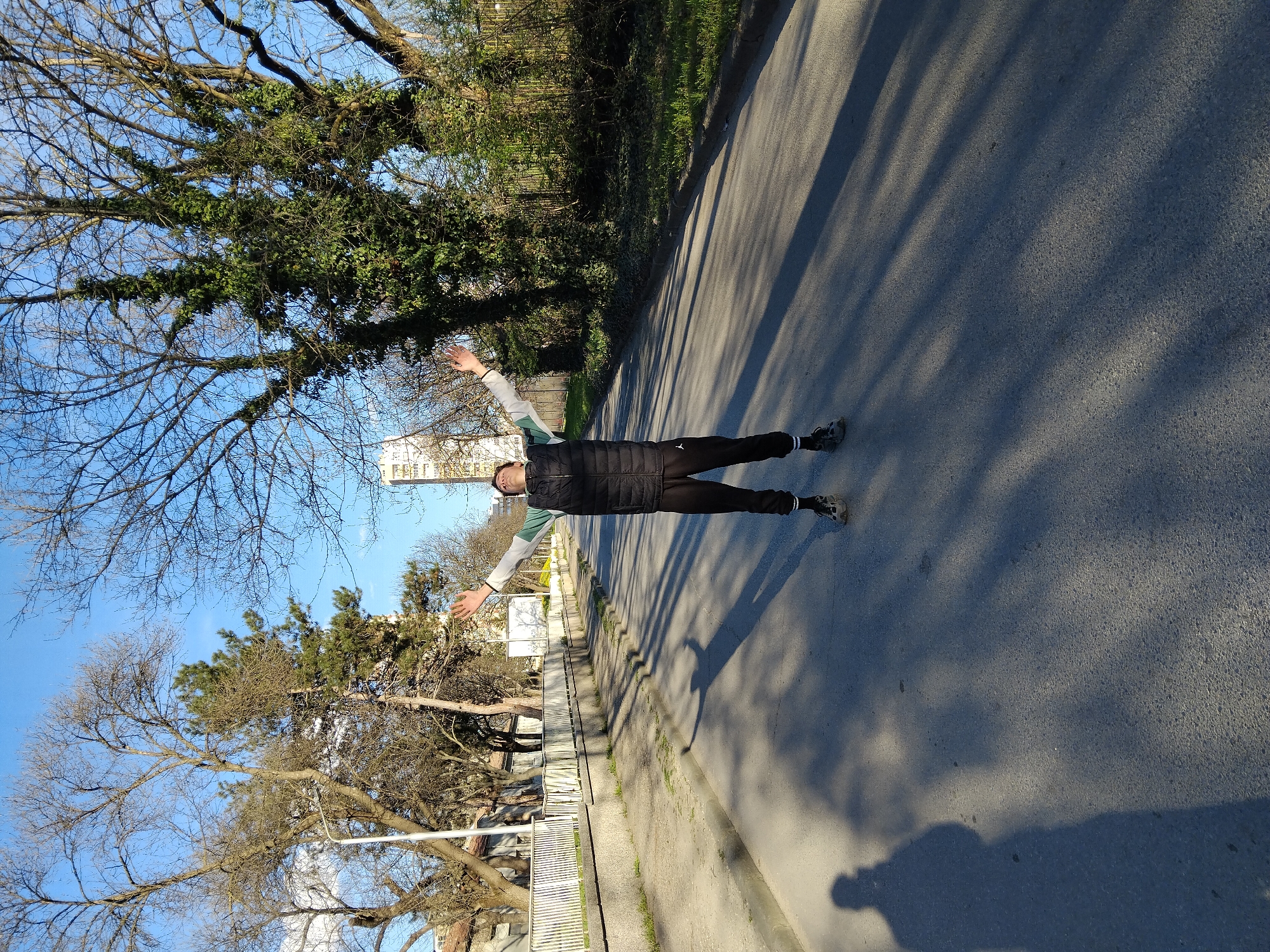 A man is standing on an asphalt road in Kazanlak, Bulgaria, with his arms outstretched. He is wearing black pants, a quilted vest, and athletic shoes. The road is flanked by trees and a metal fence on the left. The sky is visible through the trees. A building is visible in the distance. Tree shadows fall on the asphalt road.