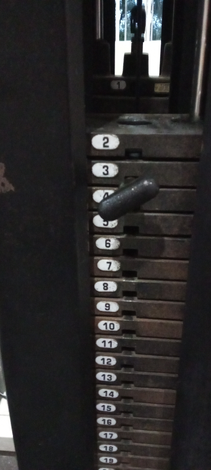 A vertical photograph depicts the weight stack of a fitness machine, located in Pacet, Indonesia