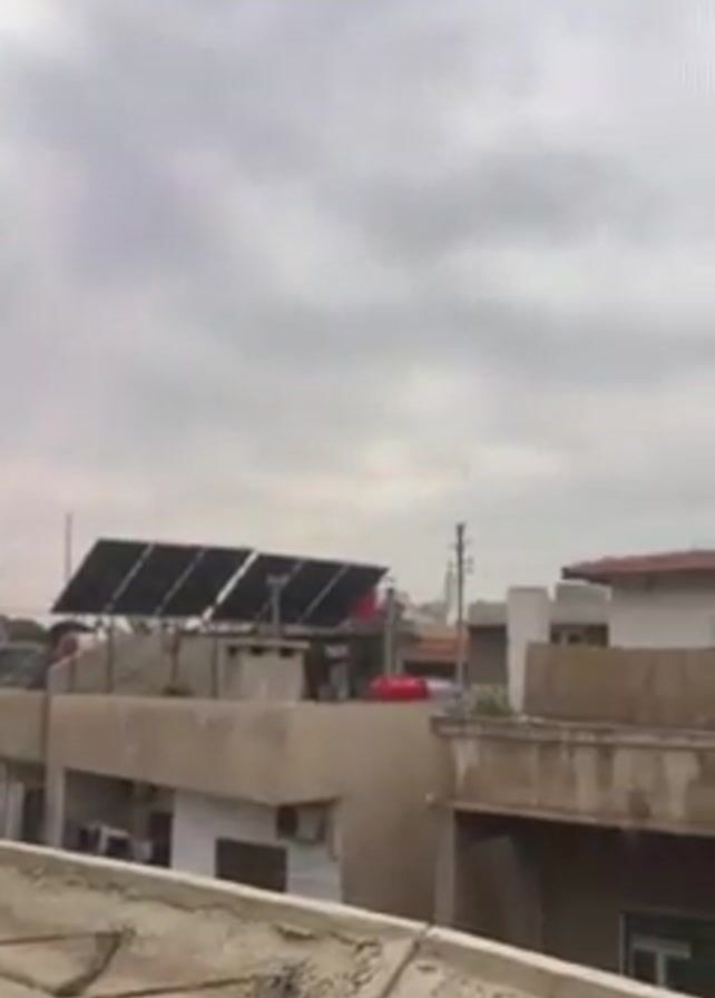 From an interior perspective behind a screened window, the video reveals an urban landscape characterized by weathered, low-rise buildings, mostly concrete and brick, under a cloudy, overcast sky. A set of solar panels sits atop one of the buildings. A few bare tree branches are visible to the right, and the overall setting implies a densely populated neighborhood.