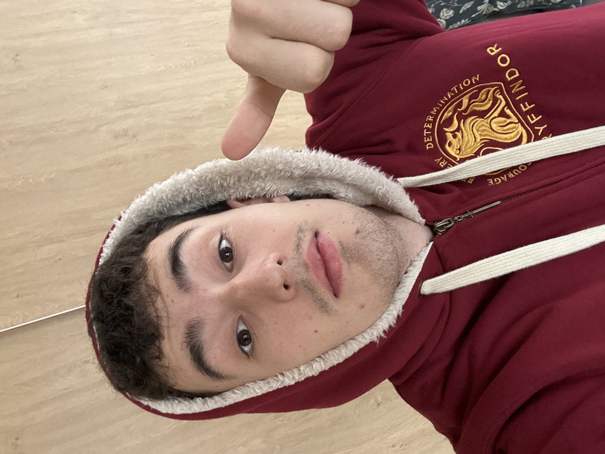 A young adult male is depicted in a close-up, upward-angled selfie or portrait, set indoors against a plain, light-colored wall, likely wood paneling. The background also shows a thin white vertical line in the upper center. The individual has short dark hair, dark eyebrows, brown eyes, and light stubble forming a mustache and beard shadow. He is wearing a dark red or maroon hooded sweatshirt with a visible front zipper and off-white drawstrings. The hood is pulled up, revealing a light cream or off-white fuzzy/sherpa lining. On the left chest area of the sweatshirt, a gold embroidered emblem is visible, featuring a lion rampant within an oval, encircled by partial text reading "ERY DETERMINATION" and "YFFINDOR," identifying it as Harry Potter-themed Gryffindor merchandise. The male is looking directly at the camera with a slightly pursed expression. His right hand is raised to shoulder level, forming a fist with the thumb extended upward in a "thumbs-up" gesture. The scene is located in Sofia, Bulgaria.