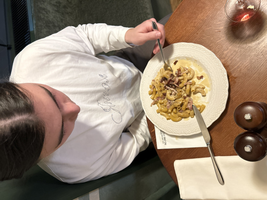 An individual with dark, centrally parted hair is depicted from an overhead perspective, seated at a dark wooden table. They wear a white long-sleeved shirt adorned with a sparkling, stylized script reading "J'adore" or a similar phrase, and grey trousers. The person is looking down at a white plate containing a partially consumed serving of cavatappi pasta with bacon and a creamy sauce. Their right hand holds a silver fork, engaged with the food. A silver knife rests horizontally to the left of the plate, adjacent to a folded white napkin. Two dark wooden salt and pepper grinders are positioned in the lower left foreground. A stemmed glass containing a red liquid is partially visible in the lower right. A white paper slip beneath the plate displays "CALL AND ASK TOMA NO.096 117 07 77," identifying the location as TOMS restaurant at Yaroslav the Wise Street, 13, Dnipro, Dnipropetrovsk Oblast, Ukraine. The immediate background features a dark green upholstered surface on the left and a dark, textured floor or carpet with a rectangular vent in the upper right.
