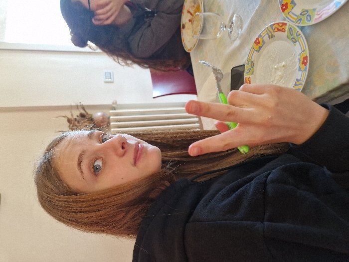 This image captures an indoor scene in Segrate, Italy, featuring two individuals seated at a table. In the foreground, a young female with long, straight light brown hair and blue eyes, wearing a black hooded sweatshirt, looks directly at the camera. Her right hand is raised, holding a green-handled fork, with her index and middle fingers extended to form a peace sign. On the table in front of her, a patterned ceramic plate contains a small amount of white residue. To the right of her hand, a dark-colored mobile phone lies flat on the tablecloth, and a clear stemmed glass is positioned nearby. In the mid-ground, a second individual with long, dark, curly hair, tied up and wearing a dark top, is partially visible. This person is seated at the table, with their right hand resting against their face, and their gaze directed away from the camera. The table is covered with a patterned tablecloth, and other partially visible patterned plates are present. The background features a light-colored wall, a vertical panel radiator, and a decorative vase containing dried natural elements. A window in the far background provides natural light, illuminating the scene.