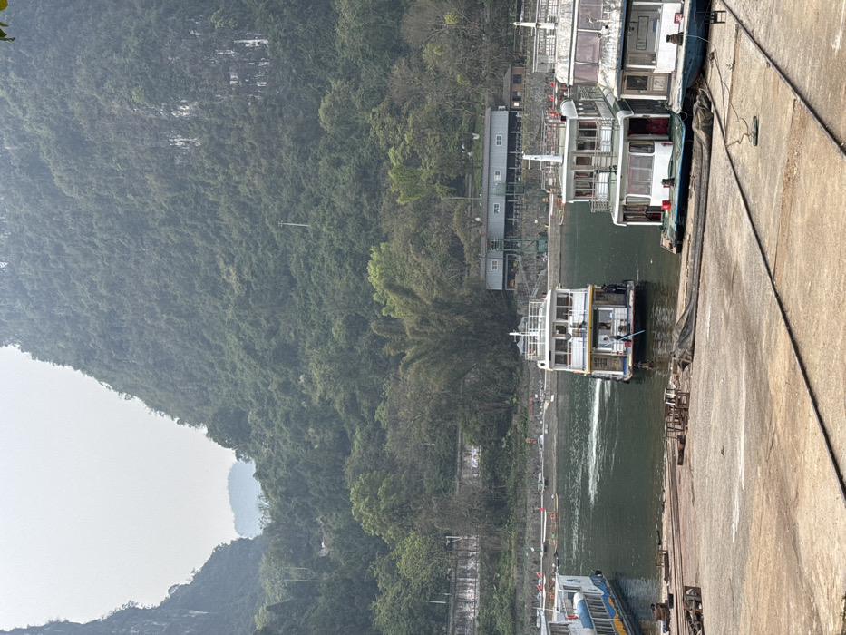 The scene depicts a river view in Guilin, China, likely a section of the Li River, characterized by prominent karst mountains under an overcast sky. In the foreground, a grey concrete dock or embankment extends across the bottom of the frame, showing horizontal lines consistent with joints or tracks. Scattered on this surface are several metal chairs, wooden planks, and a dark tarp or net. On the dark green water, a white, multi-deck passenger boat with dark blue trim is in motion, oriented away from the viewer, leaving a distinct white wake behind its stern. Two human figures are visible on the lower deck of this vessel. To the right of the moving boat, two additional multi-deck passenger boats, primarily white with red and blue accents, are moored stationary at the river's edge. A portion of a blue and white boat is visible docked on the far left. The far bank features a concrete retaining wall with some green vegetation. Above this wall, dense green foliage, including tall bamboo clusters, blankets the lower slopes. Further back, a light-grey, multi-story building with a dark roof stands on elevated ground, accompanied by a smaller brown structure nearby, possibly a utility or storage building. A green-colored structure, possibly a crane or scaffolding, is situated between the larger building and the river. The background is dominated by towering karst mountains, heavily covered with lush green vegetation and trees. Some sections of lighter, exposed rock are visible on the steep mountain faces. The distant mountains appear hazy under the muted sky, and a utility pole is discernible on one of the slopes.