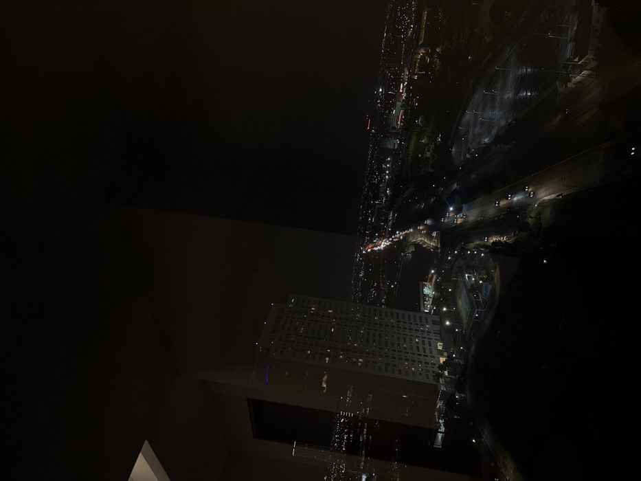 The image presents an elevated nighttime urban panorama of Puebla City, Mexico, specifically depicting the Reserva Territorial Atlixcáyotl area. A prominent, light-colored high-rise building, displaying a "JW Marriott" illuminated sign, stands in the left midground. Reflections within the viewing glass introduce a vertical seam and a fainter, superimposed image of a dark structure on the far left. Below, multi-lane roadways appear wet, indicating recent precipitation, and are populated by vehicles visible as streaks or dots of light from their headlights and taillights. Numerous streetlights illuminate these thoroughfares. The distant cityscape extends under a dark sky, marked by widespread artificial illumination from buildings and infrastructure. No individuals are discernible.