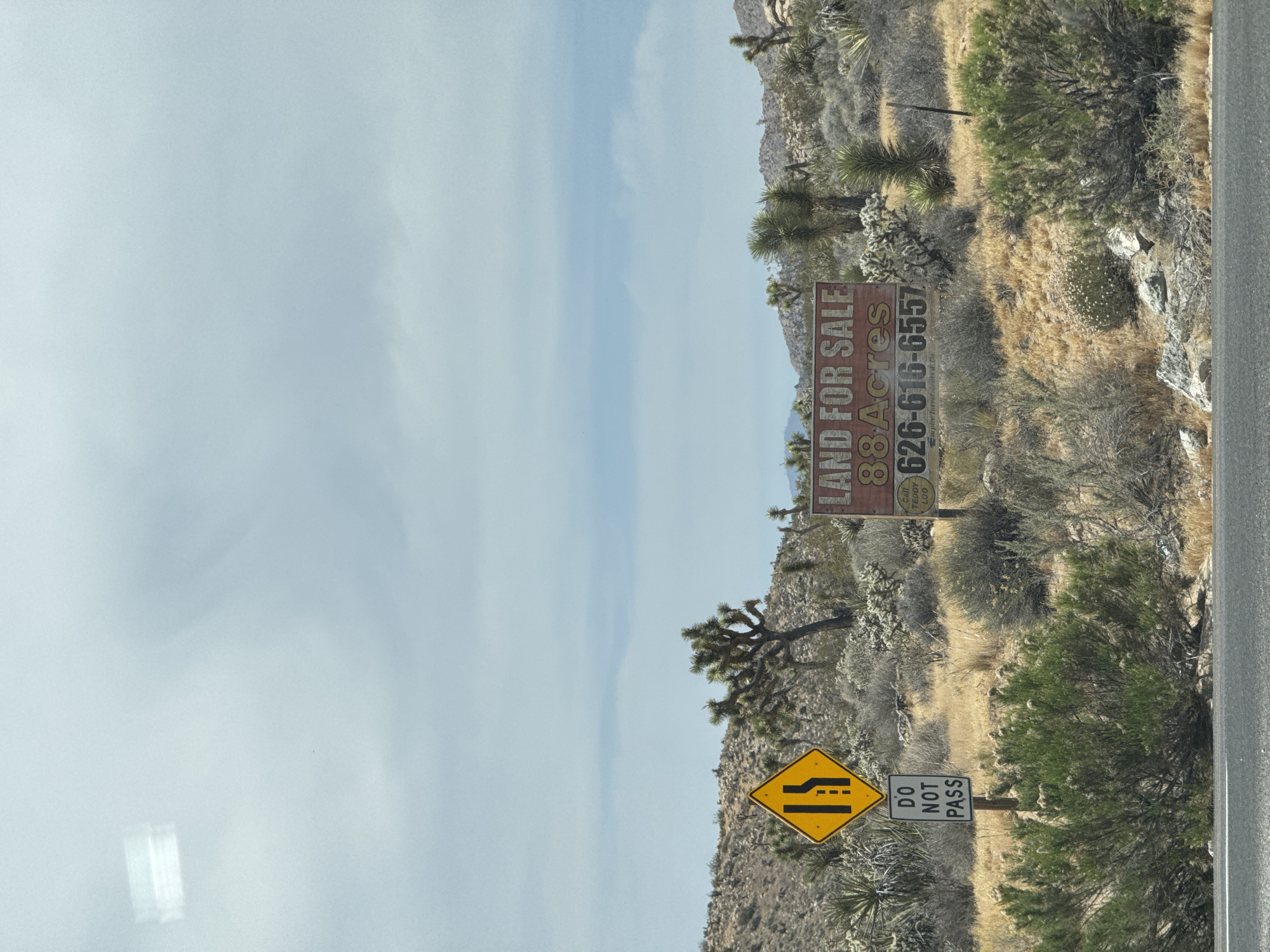 roadside scene in Yucca Valley, USA. A yellow diamond-shaped road sign warns of a lane reduction, and a rectangular "DO NOT PASS" sign is also visible. Further up a "LAND FOR SALE 88 Acres" sign displays a phone number "626-616-6557". The environment consists of arid vegetation, including Joshua trees, and rocky terrain characteristic of the desert landscape. The sky above is overcast, and a portion of the road occupies the bottom right of the frame.