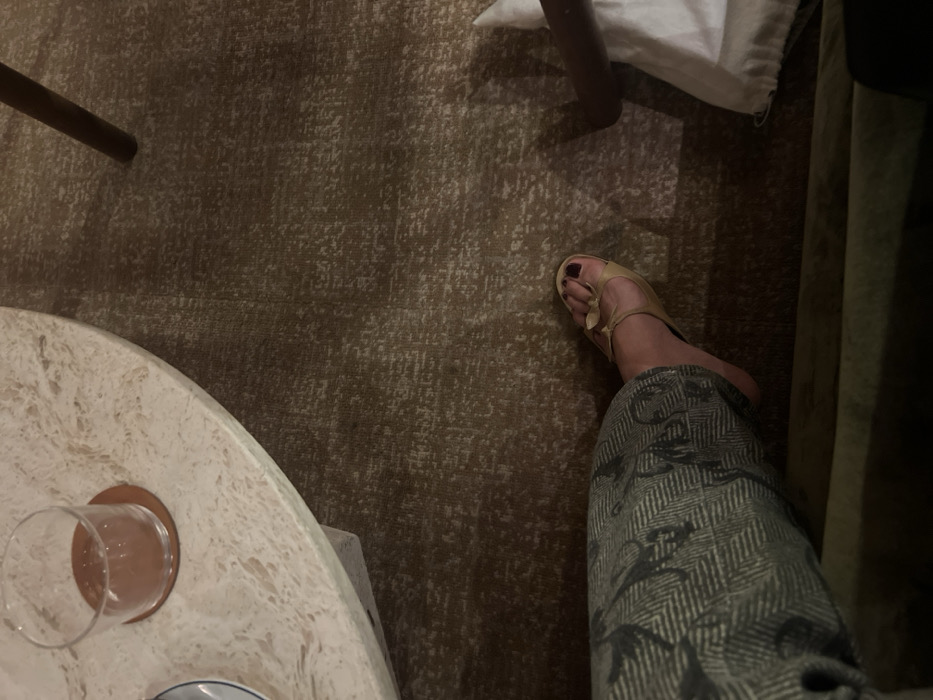 An overhead shot features a person's lower leg, clad in patterned gray pants, and a sandal-clad foot with dark polished toenails