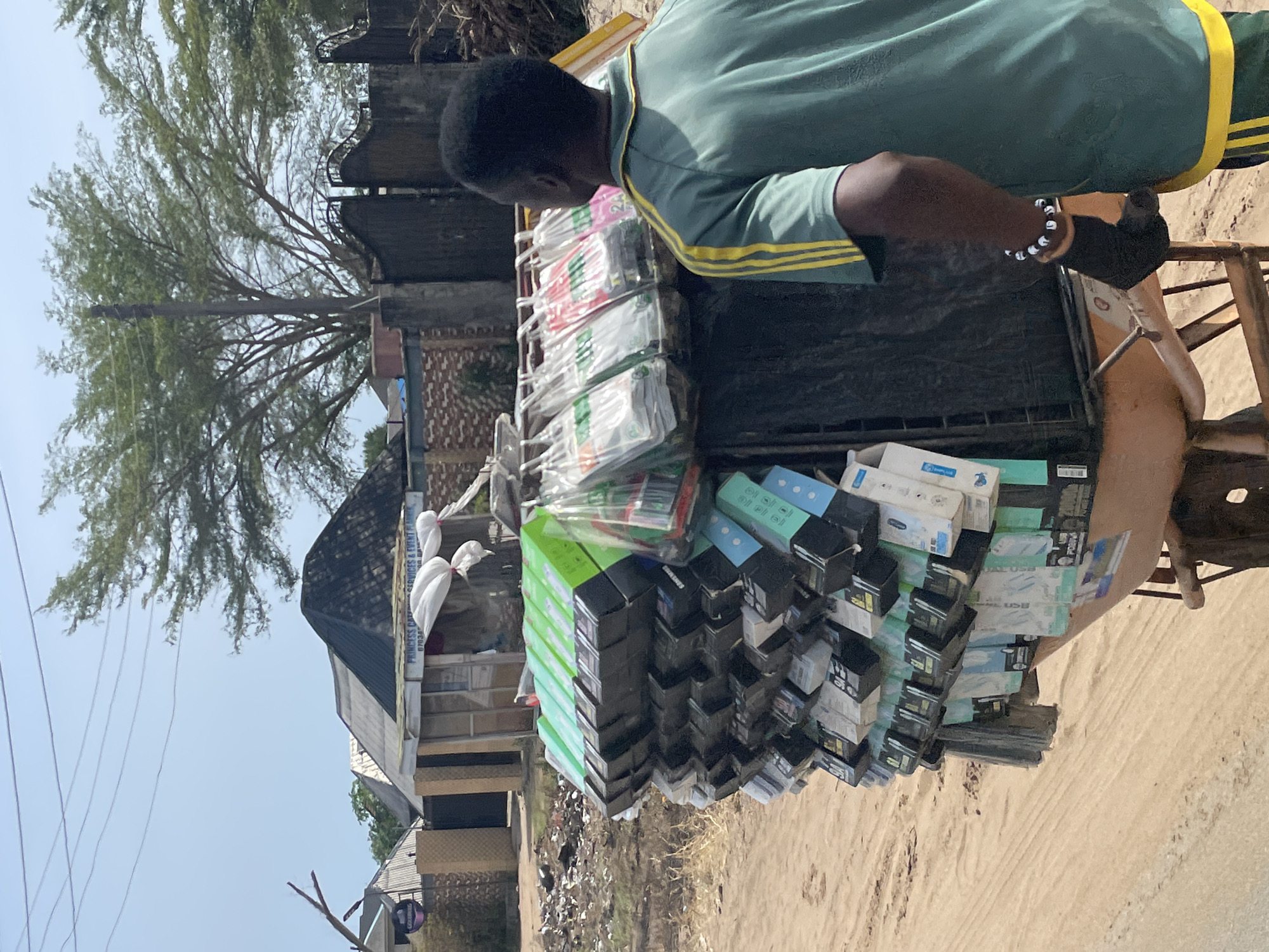 In Ikoga, Nigeria, a man in a green and yellow shirt is pulling a cart. The cart is heavily loaded with various boxed and packaged items. A building is visible in the background. The scene is outdoors, and the ground appears to be sandy or dirt-covered.