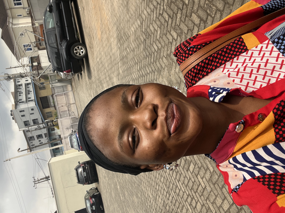 The image displays a young adult female positioned centrally in a close-up outdoor selfie. She has dark skin, wears a black headwrap, and a multicolored, patchwork-patterned collared shirt featuring red, yellow, blue, white, and black sections. Clear, faceted hoop earrings are visible on her ears. Her expression is a smile with her tongue slightly extended between her lips. A brown leather strap from a shoulder bag is visible over her right shoulder. The scene is set on a paved surface composed of light-grey interlocking bricks under a bright, overcast sky. In the background, an urban environment unfolds. From left to right, parked vehicles include a dark-colored sedan and two dark-colored SUVs, one identifiable as a black Toyota 4Runner. Utility poles with multiple overhead power lines are prominently visible against the sky. Several multi-story buildings, one light-colored with visible balconies and another with a brown roof and a white, arched metal canopy, constitute the primary architectural elements. A white metal gate is partially visible on the right. The architectural styles, common vehicle types, visible utility infrastructure, and interlocking brick pavement are consistent with an urban or semi-urban area within Lagos, Nigeria. The precise street or specific neighborhood within Lagos cannot be determined from the available visual information.