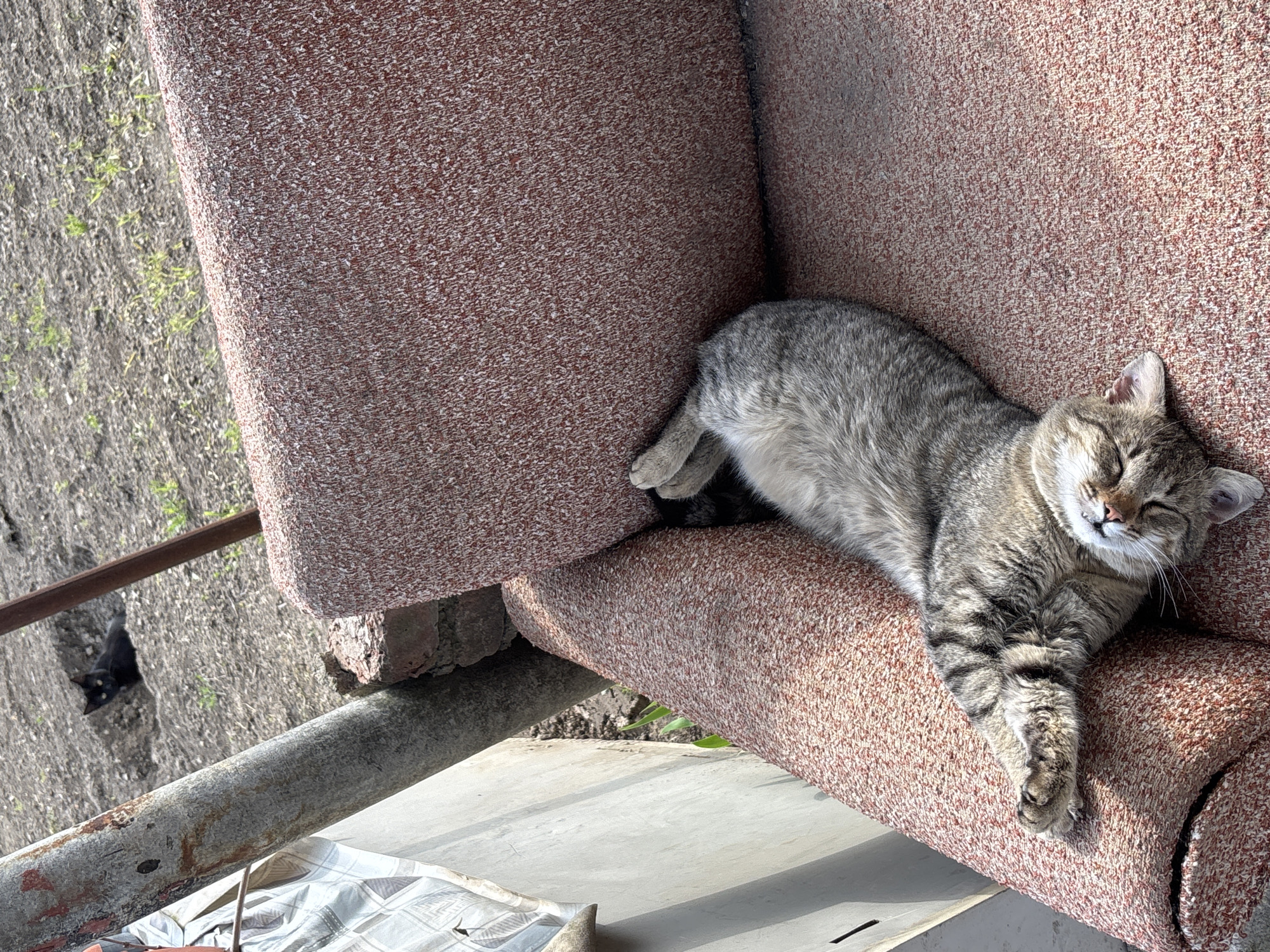 - "An outdoor scene in Slavyanovo, Bulgaria, depicts a tabby cat asleep on its back on a reddish-brown, textured outdoor sofa" by FM-naVU72, licensed under CC BY 4.0