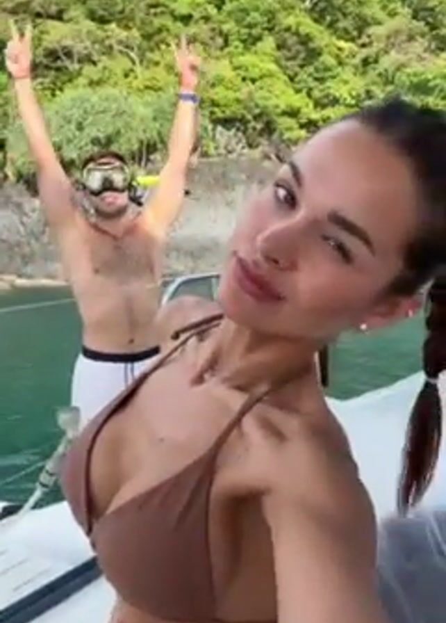 woman on a boat, with a man in the background. The woman is wearing a brown bikini top and a necklace. Her hair is in a braid. She winks, smiles, and sticks her tongue out at the camera. The man is wearing white shorts and a snorkeling mask on his forehead. He raises his arms in the air. The boat is in the water, and there is a green, tree-covered shoreline in the background.