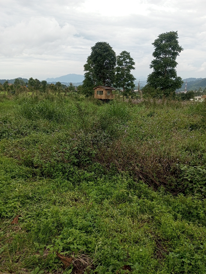 The image portrays an outdoor scene within the city of Abbireddygudem, India, under an overcast sky. The foreground is occupied by dense, unmaintained green vegetation, consisting of various grasses, shrubs, and weeds, with some dry leaves visible on the ground. In the middle distance, an elevated, small, light-brown wooden structure, resembling a cabin or treehouse, is observed. It features a visible multi-paned window and a dark-colored roof. This structure is positioned amidst three prominent tall trees with dense green foliage. Additional trees and vegetation extend behind the structure. The background reveals hazy hills or mountains. To the far right, partial views of light-roofed buildings and a faint vertical structure, possibly a communication tower or utility pole, are present, indicating urban proximity. No individuals, discernible actions, or interactions are visible within the frame.