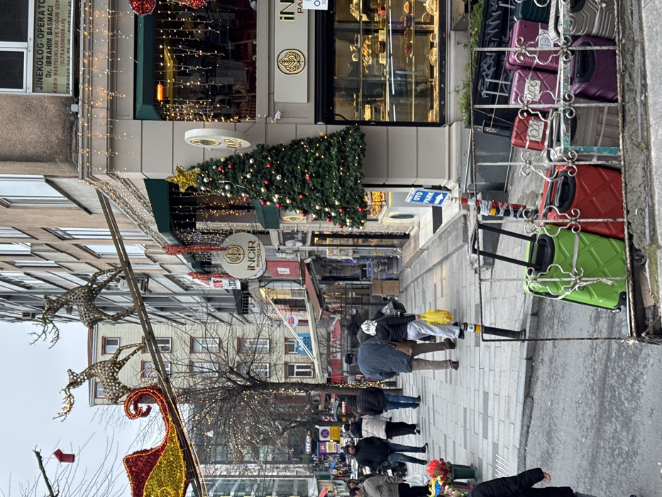 The image depicts an urban street scene in the Pangaltı neighborhood of Şişli, Istanbul, Turkey, under an overcast sky. The view is oriented down a paved sidewalk on the left, with multi-story buildings lining both sides of the street. Overhead, suspended across the street, are large, illuminated Christmas or New Year decorations consisting of two golden reindeer pulling a red and gold sleigh. String lights are draped across the storefronts. A prominent corner building on the right features a green awning, large display windows, and a decorated Christmas tree adorned with red and gold baubles and a star, affixed to its exterior corner. A round sign for "INCIR PANGALTI" is visible on this building. Above, a sign reads "JİNEKOLOG OPERATÖR DR. İBRAHİM BAŞMACI," indicating a gynecologist's office. Approximately 10-15 individuals, dressed in winter clothing such as coats and jackets, are walking on the sidewalk, generally moving away from the viewer. One person in the mid-ground carries a yellow plastic bag. On the far left, a person is partially visible near a display of red and yellow flowers. In the immediate foreground, positioned on a low railing or display rack, are multiple brightly colored suitcases with wheels. Prominently visible are a large lime-green suitcase and a red suitcase, secured by straps. Behind these, additional suitcases in shades of purple and gray are displayed, some bearing white price tags. A blue and white "OTO PARK" (parking) sign with an arrow pointing right is visible near the base of the corner building. Bare tree branches with small lights are visible between the buildings on the left.