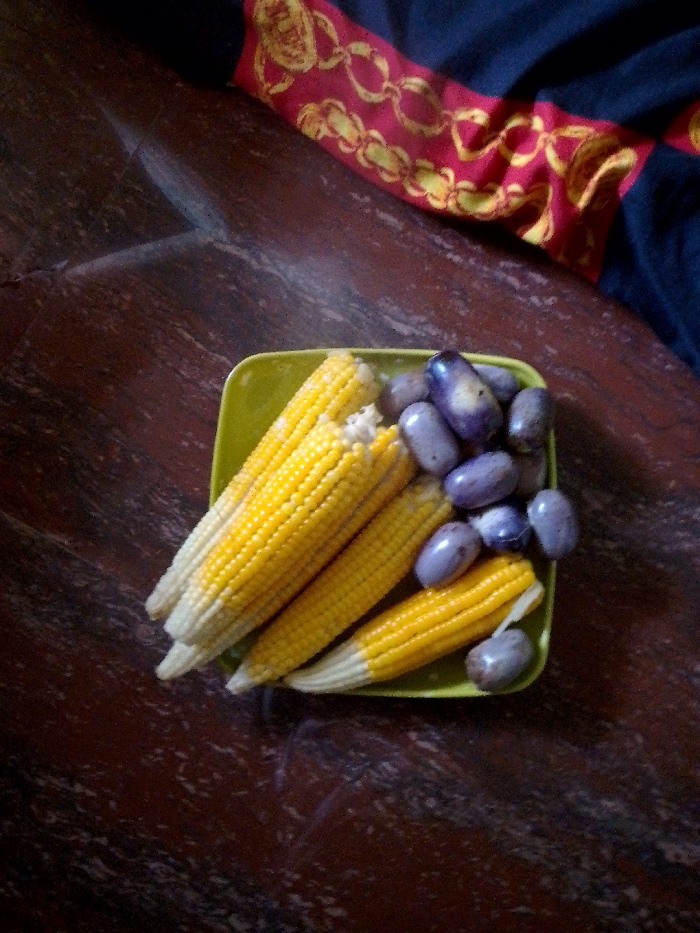 This image captures an indoor scene within the city of Unknown, Unknown. A light green, square-shaped plate is centrally positioned on a dark reddish-brown wooden table, displaying visible grain patterns. The plate holds five partially husked ears of bright yellow corn, arranged diagonally on the left side. Adjacent to the corn, on the right side of the plate, is a cluster of approximately fifteen dark purple, ovoid-shaped fruits, consistent with African pears (Dacryodes edulis), some exhibiting lighter blemishes. In the upper right portion of the frame, a dark fabric featuring a prominent red band with a golden chain-link pattern is partially visible. No individuals, actions, or interactions are present in the scene.