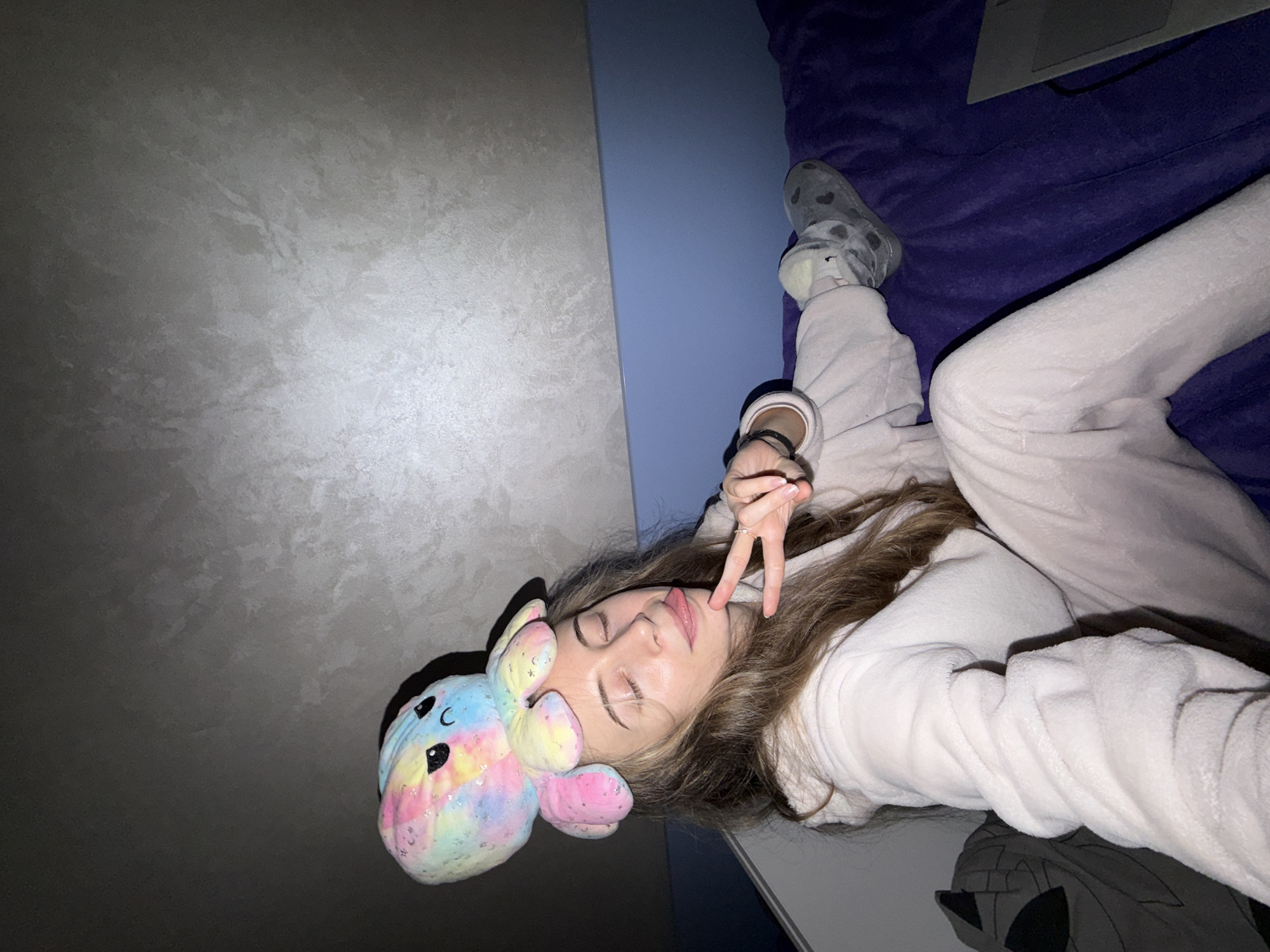 A young woman in a white pajama set and grey slippers is lying on a purple blanket in a room. She is holding up a peace sign with her right hand near her face and sticking her tongue out. She has light brown hair and is wearing a plush, colorful unicorn hat. The background includes a grey wall, a blue wall, and a possible laptop. There are no indications that this image was taken in Plovdiv, Bulgaria.