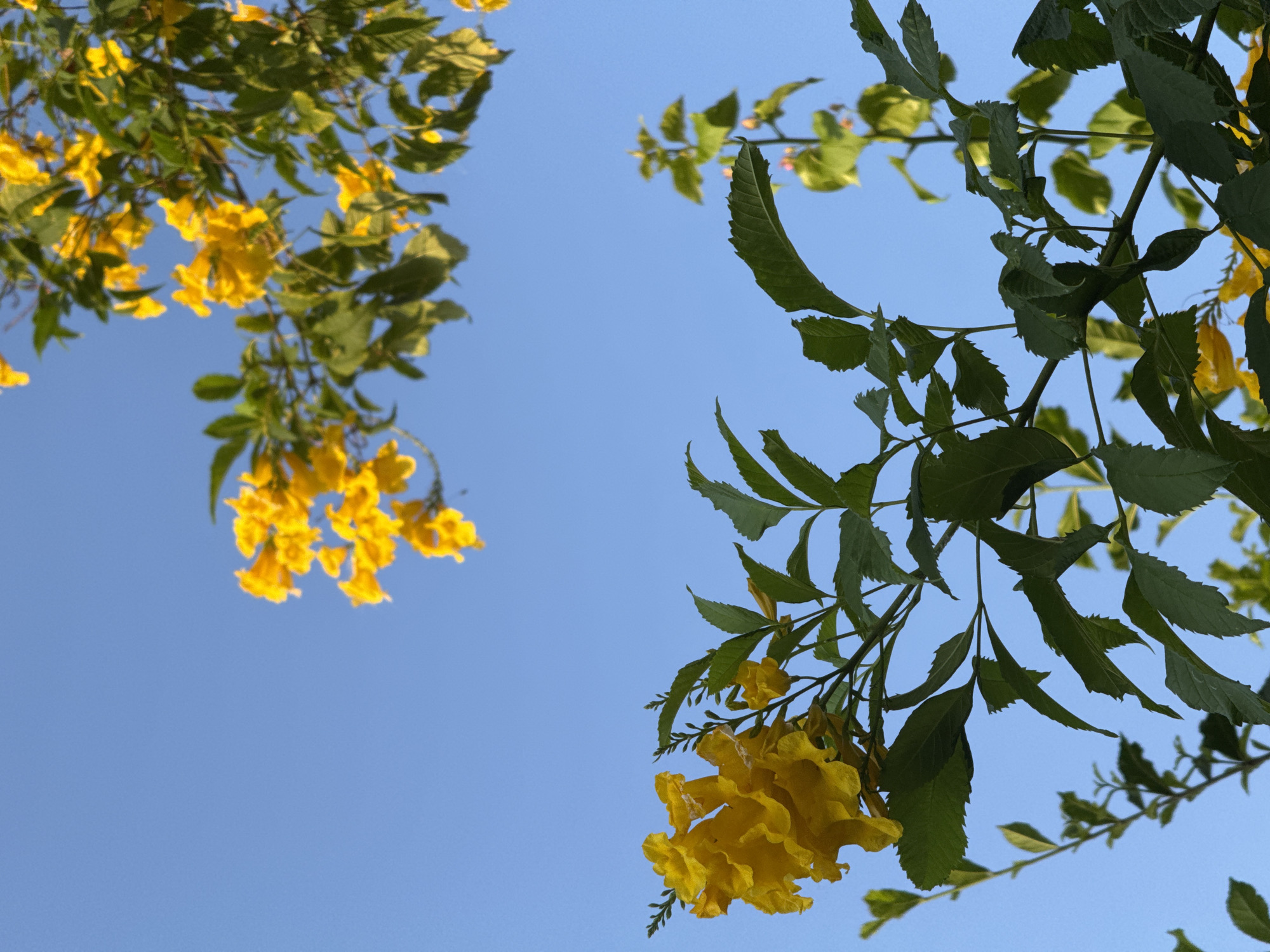 - "The image displays a close-up, low-angle view of flowering plant branches against a clear, unblemished blue sky" by FM-BQyrk1, licensed under CC BY 4.0