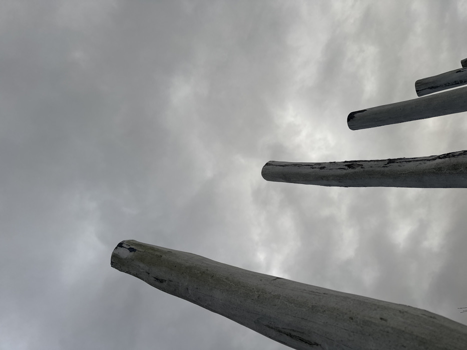 Several wooden poles rise diagonally into a cloudy, overcast sky