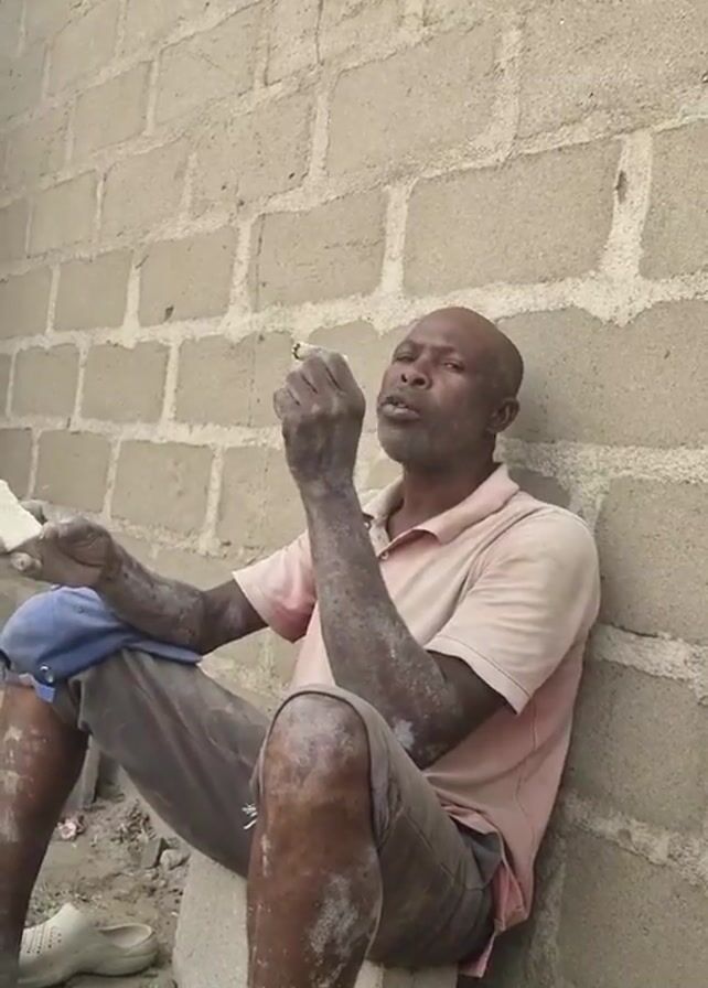 A man is sitting outside a cinderblock wall, smoking. He is bald, light-skinned, and wearing a tan t-shirt and brown pants. He has a blue baseball cap resting on his lap. He is holding a small white block in one hand and a lit cigarette in the other. He appears to be exhaling smoke. The wall behind him is made of gray cinderblocks. On the ground next to him is a pair of white sandals. The area around him is littered with debris. The lighting suggests it is daytime.