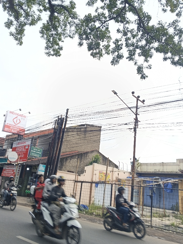 A street scene showcases several motorcycles in motion, with riders wearing helmets. A power pole laden with wires stands to the right. Buildings line the background, including one with a large "INDOGADAI" sign and smaller advertisements. Trees overhang from above, partially obscuring the sky. A fence encloses a structure with blue tarps, adding to the urban atmosphere.