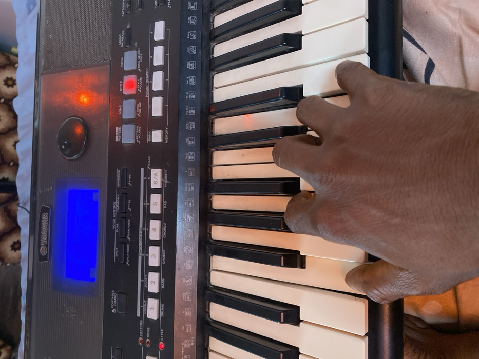A Yamaha keyboard dominates the image, featuring a blue LCD screen and various buttons labeled “SONG,” “STYLE,” “VOICE,” and more