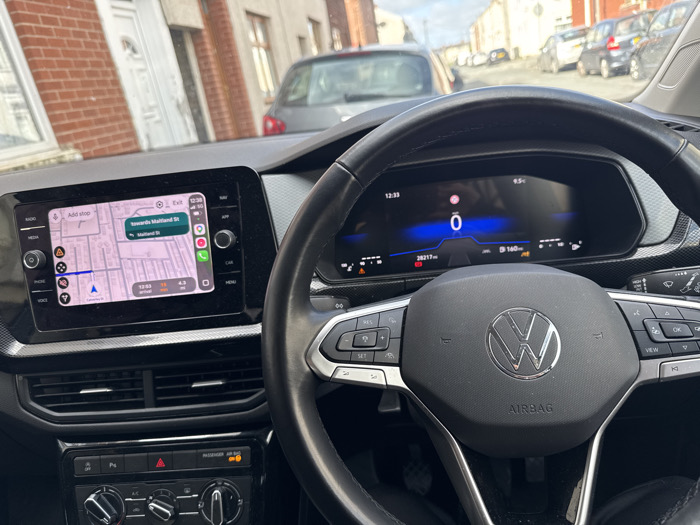 The image displays the interior of a Volkswagen vehicle, viewed from the driver's perspective, while stationary on a residential street in Preston, United Kingdom