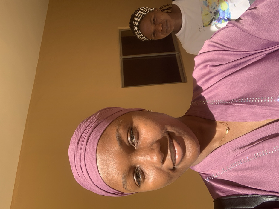 Two women pose indoors. The foreground woman wears a purple hijab and matching top with silver embellishments. A gold necklace is visible. Behind and above her, a second woman with a patterned headband smiles. A small, closed window appears in the background, against a light brown wall. The perspective is angled upwards.