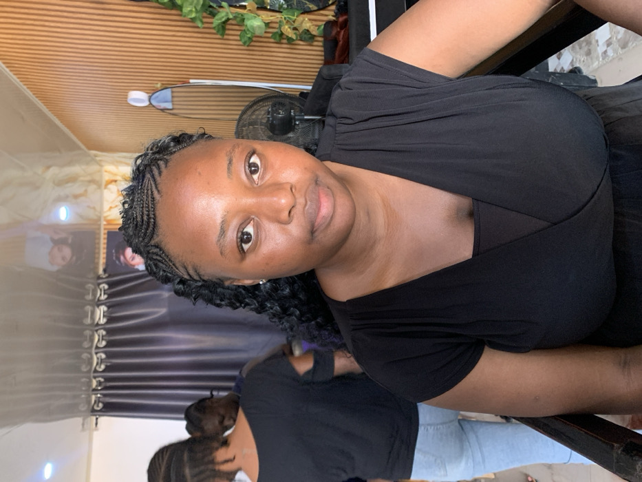 The image displays an interior scene, identified as a hair salon or beauty parlor. A dark-skinned female, appearing to be a young adult, is centrally positioned in the foreground, seated, and looking directly at the camera with a neutral expression. Her hair features cornrows braided neatly along the scalp at the front, transitioning into black, wavy or curly extensions. She is wearing a black, short-sleeved top with a v-neck design. In the blurred background, to the left of the main subject, two other individuals are partially visible. One person, seen from the back, is wearing a black t-shirt and light blue jeans, appearing to be engaged in a hair styling activity. Another individual is partially obscured behind them, also seemingly involved in the salon's operations. The environment includes a light brown, vertically-slatted panel wall on the right side of the frame, a tall, narrow mirror, and a black stand fan positioned behind the main subject. Dark, pleated curtains are visible on the left side of the background, potentially covering a window or entrance. Recessed ceiling lights and framed wall art, including images of individuals with styled hair, contribute to the salon's decor. There are no specific visual identifiers within the image to confirm a location in the city of Jos, Nigeria.