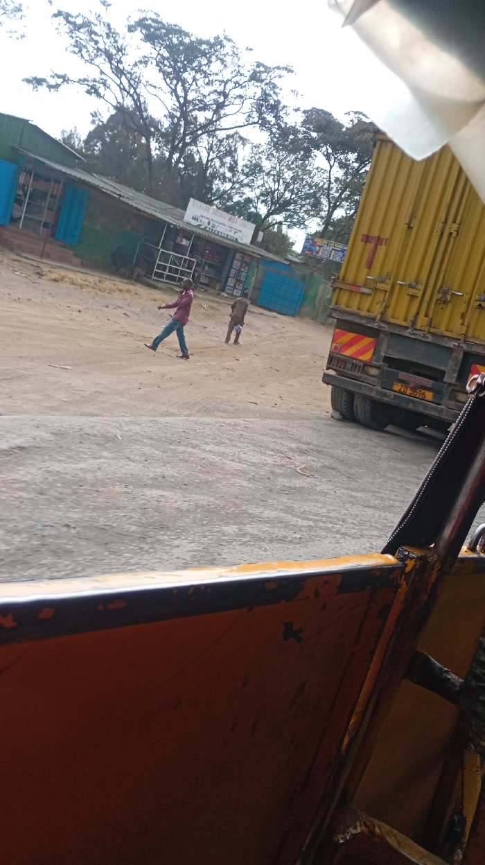 The photo captures a street scene. A yellow truck is parked on the right, while two people walk on a dirt road beside a shop with a green roof and blue shutters. The image is taken from the perspective of someone inside an orange vehicle, possibly a tuk-tuk, with parts of the frame visible in the foreground. The background includes trees and an overcast sky.