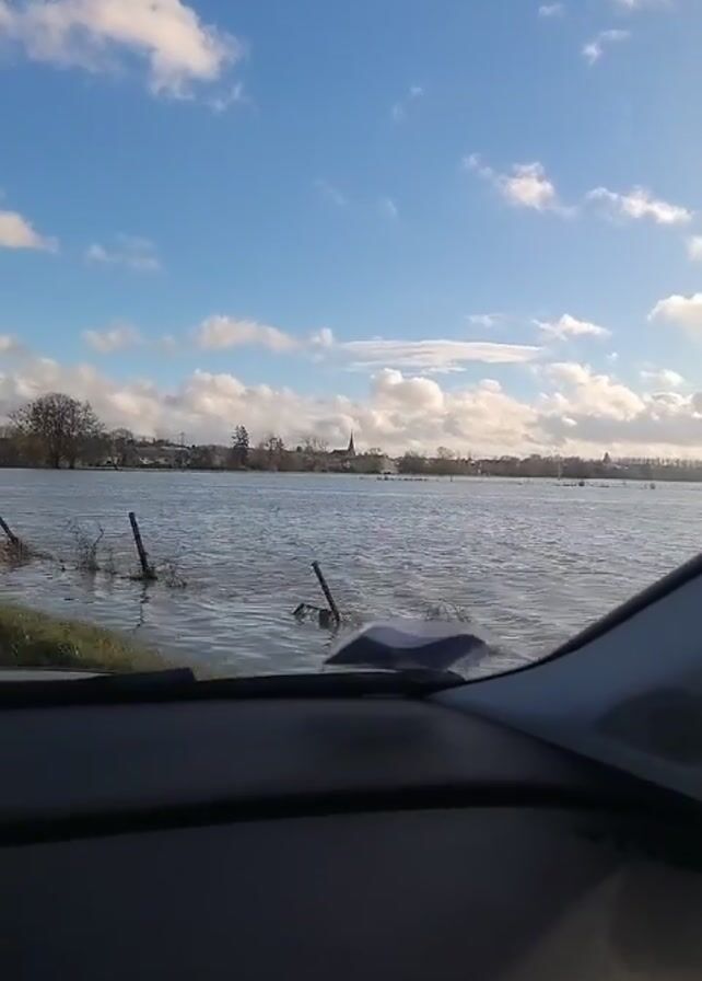 A car interior view shows an expansive flooded field under a bright blue sky with scattered white clouds