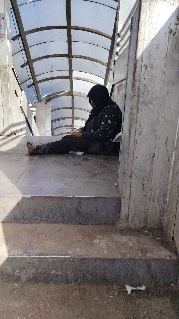 The image displays an individual seated on a concrete landing within a pedestrian overpass or underpass structure in Sarouja Municipality, Syria