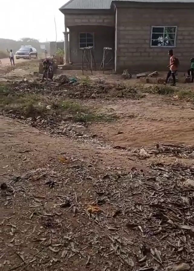 The video presents a street scene with a house in the background. The house is made of gray concrete blocks and has a gray corrugated metal roof. A woman is standing near the house, tending to the ground with a tool. Several children are running and walking in the area. The ground is mostly dirt, with patches of grass and scattered debris, including leaves and trash. In the distance, a car and several people can be seen further down the street. The overall atmosphere seems casual and commonplace, depicting everyday life in a residential area.