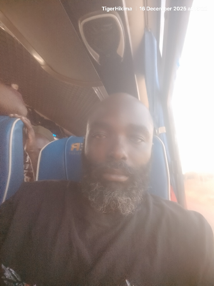 A selfie captures a man with a dark complexion, bald head, and a full, salt-and-pepper beard. He wears a dark t-shirt and sits in a blue seat, likely on a bus. Another person is visible in the background. Bright light streams in from a window to his right. The words "TigerHikima" and "16 December 2025 at 18:22" are superimposed on the image. The overall lighting is soft, casting shadows and highlights across his face.
