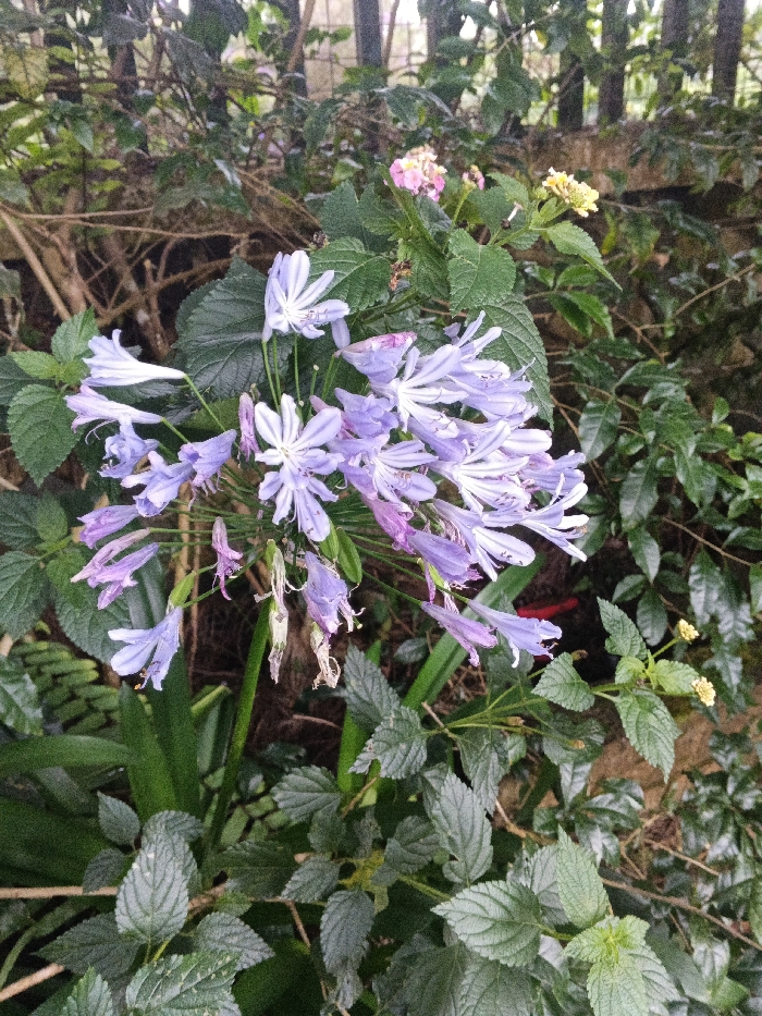 The image depicts a close-up outdoor scene in Kadoma, Zimbabwe, dominated by a large inflorescence of light purple-to-lavender Agapanthus flowers, prominently featured in the central foreground. Numerous individual florets are visible, displaying striped petals and prominent stamens; some florets appear fully open, while others are partially closed or beginning to wilt. The main flower cluster emerges from dense green foliage, including broad, dark green leaves and narrower, strap-like leaves at its base. In the background, further vegetation is present, characterized by intertwining green leaves, some appearing serrated, and sections of bare, woody branches. Towards the upper right and center background, two smaller clusters of flowers are visible: one with light pink blossoms and another with light yellow/cream blossoms, consistent with Lantana species. A faint red object or element is partially discernible among the foliage in the mid-right background. The overall lighting suggests an outdoor environment, possibly under diffused light conditions. No human figures or discernible animal life are present.