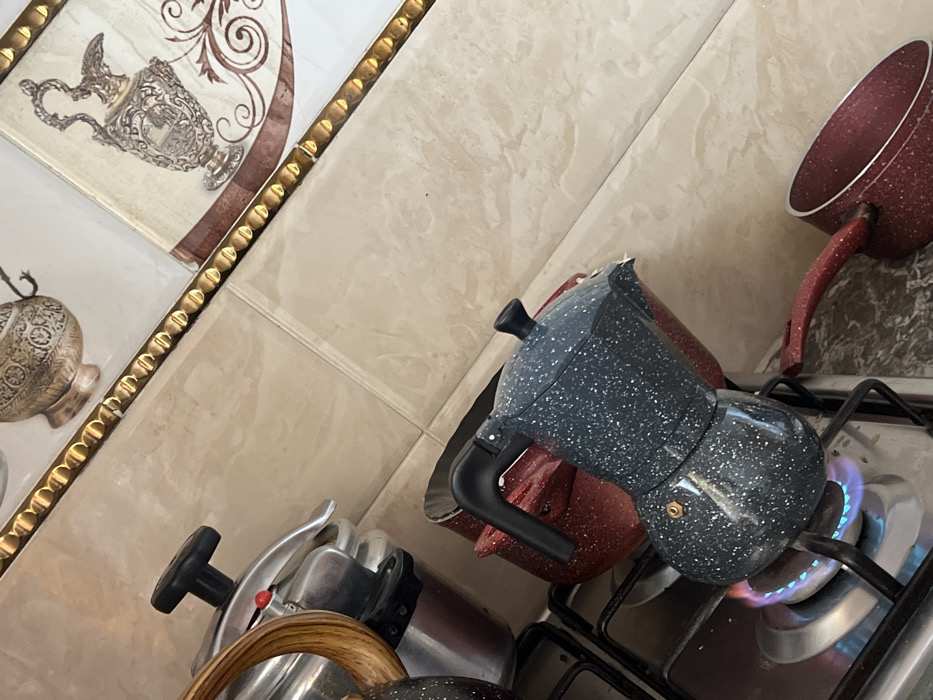 The image depicts a kitchen scene in Salé, Morocco, focusing on a gas stovetop and adjacent counter area. A grey speckled Moka pot with a black handle is centrally positioned on a gas burner, where a blue flame is active underneath, indicating it is in use. To the left and slightly behind the Moka pot, a stainless steel pressure cooker with a black handle is partially visible. Behind the Moka pot, a red speckled pot is present. To the right of the Moka pot, a red speckled saucepan with a handle is resting on the countertop. The background features light beige tiled walls. Above these plain tiles, a decorative gold-colored border of repeating half-sphere elements separates them from upper wall tiles. These upper tiles display artistic depictions of ornate, antique-style pitchers or vases in brown and gold tones. No individuals are visible in the frame.