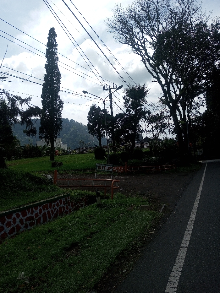 This image displays an outdoor scene in the city of Chhenangri_Rishor, Bhutan, captured on an overcast day. In the immediate foreground, a low, decorative wall constructed from red-brown stones with white mortar patterns runs along the bottom left, bordering a section of short green grass. Adjacent to this, an orange-brown metal barrier, consisting of two horizontal bars, obstructs a dirt path. A white sign with "TUTUP" in black capital letters is attached to the upper bar of this barrier. To the right of the barrier and path, an asphalt road with a solid white lane line on its right edge extends diagonally into the frame. The midground features a grassy area with multiple trees. A tall, slender coniferous tree stands prominently to the left of center. To its right, a utility pole supports numerous overhead power lines and a streetlamp. Further right, a large tree with a dense, gnarled canopy is silhouetted against the sky. Various other trees and sparse vegetation are visible across the midground. The background consists of a tree-covered hillside or mountain range under a bright, cloudy sky. No human figures or active subjects are present in the depicted scene.