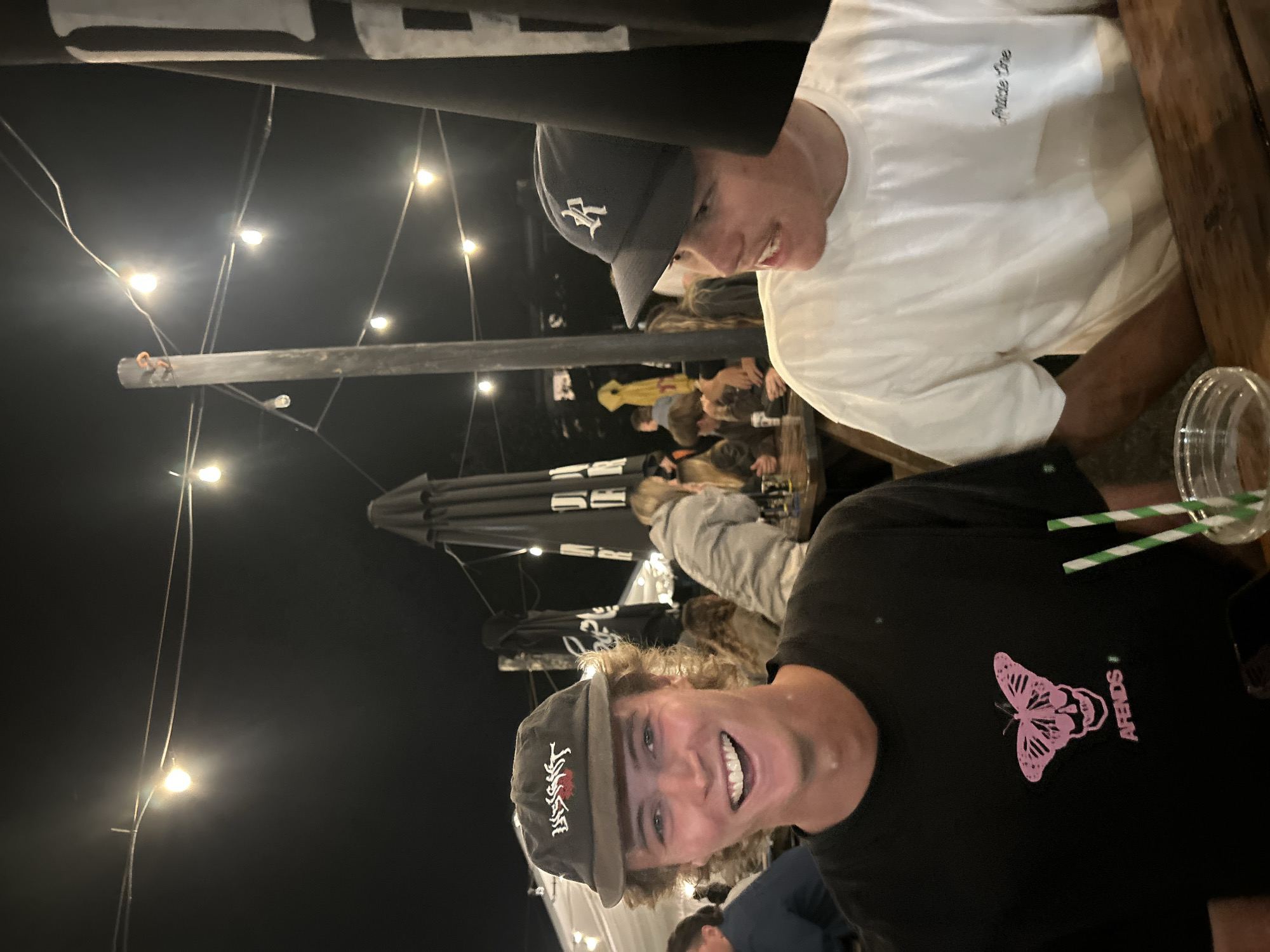 A nighttime scene depicts an outdoor or semi-outdoor establishment in Wombarra, Australia, illuminated by suspended string lights. In the foreground, two young adult males are seated at a wooden table. The male on the left, with light brown curly hair, smiles broadly towards the camera, revealing teeth. He wears a dark flat-brimmed cap with a white and red design and a black t-shirt featuring a pink butterfly-skull graphic and the text "AFENDS". A clear glass containing a drink with two green and white striped straws, and a dark smartphone, are on the table in front of him. The male on the right wears a dark blue baseball cap with a white "R" logo and a white t-shirt with "Article One" embroidered on the left chest. He is positioned looking to his left, with his right forearm visible on the table. The background shows multiple indistinct figures seated at tables, dark closed parasols or umbrellas, and wooden poles supporting the string lighting.
