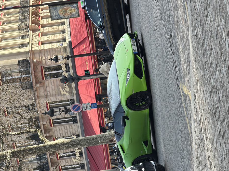 The image depicts a daytime street scene in Paris, France, specifically on a cobblestone road in front of Fouquet's Brasserie, located at 99 Avenue des Champs-Élysées. The sky is clear. In the mid-ground, a bright lime-green Lamborghini Huracán Spyder convertible, license plate HC-140-AR, is prominently positioned on the cobblestone street. The vehicle features black multi-spoke wheels with visible green brake calipers and its soft top is retracted. To its immediate left, the front quarter of a white vehicle is visible. To its right, a black Mercedes-Benz sedan, identifiable as a taxi, is partially visible. Street infrastructure includes a black ornamental lamppost, a traffic light displaying a red signal for vehicular traffic and a green signal for pedestrians, and multiple blue street signs. A circular sign indicates "No Parking" (interdit de stationner), and a rectangular sign below it reads "INTERDIT SAUF AUX LIVRAISONS" (Forbidden except for deliveries). A large, bare-branched tree trunk occupies the left side of the frame. The background features the light-colored stone facade of the Fouquet's building, characterized by multiple windows with black wrought-iron balconies and prominent red awnings over the ground-floor level. The gold "Fouquet's" lettering is affixed to the building's facade. Several indistinct pedestrians are visible on the sidewalk behind the vehicles and along the building.