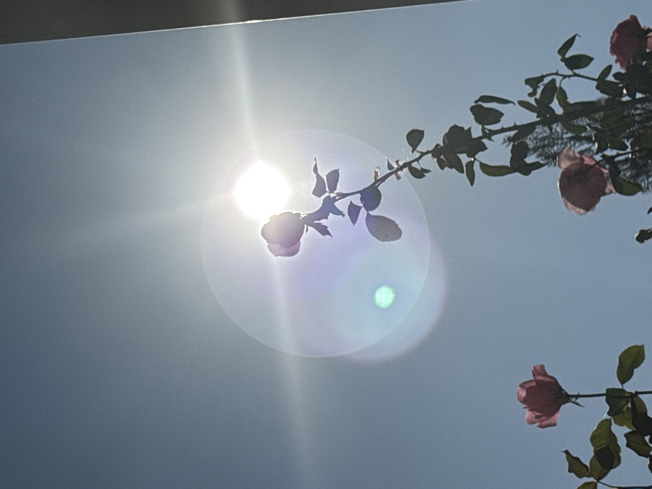 An outdoor scene in Armavir, Armenia, captured under direct sunlight. The dominant feature is a bright, overexposed sun in the upper-center-right, producing significant lens flare characterized by a large circular halo with internal chromatic aberrations and a distinct green-blue circular artifact to the lower-left of the sun. The sky is a clear, light blue. Multiple rose bushes or stalks are depicted, primarily silhouetted against the bright sky. A prominent rose stem extends from the lower-right towards the upper-center, topped by a single rose bloom that is strongly backlit, appearing as a dark pink silhouette with visible petals. Its leaves are dark green to black. Additional rose blooms, also appearing dark pink and backlit, are visible in the lower-left and lower-right portions of the frame, accompanied by dark foliage. No human figures or artificial structures are discernable beyond what may be a partial vertical edge of a structure on the far right.