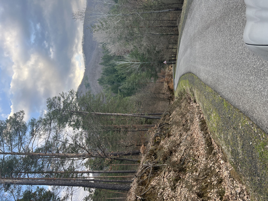 The image displays a winding asphalt road through a forested, mountainous area in Diadovtsi, Bulgaria. The perspective is from a low vantage point, with a portion of a light-colored vehicle's hood visible in the bottom right corner. The road, dark gray and well-maintained, curves sharply to the right in the midground and then gently left into the distance. To the immediate left of the road, a steep embankment is covered in dry, brown fallen leaves and exposed tree roots, indicating a period of deciduous leaf fall. Above this embankment, a dense forest consists primarily of tall evergreen pine trees with dark trunks, intermixed with bare deciduous trees. To the right of the road, a narrow strip of ground with patchy green moss and dark soil gives way to another section of mixed forest, featuring both evergreen trees and numerous bare deciduous trees. Further along the curve on the right side of the road, a triangular red-bordered warning sign is visible, possibly indicating a sharp bend, adjacent to a dark vertical post or fence. In the background, rolling mountains rise under an overcast sky characterized by varying shades of gray and brighter patches, suggesting partial sunlight. The mountainsides are largely covered with bare deciduous trees, giving them a muted brown-gray appearance, with interspersed patches of evergreen foliage. There are no human subjects, active vehicles (other than the implied photography platform), or identifiable man-made structures beyond the road and sign. The scene conveys a late autumn or early winter forest environment.