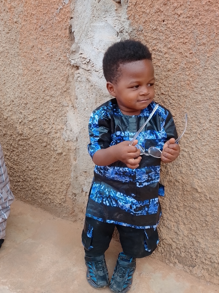The scene is located outdoors in the city of Television, Nigeria. A young child, appearing to be a boy with dark skin and short black hair, stands centrally, slightly angled to the right. He wears a short-sleeved tunic with a blue and black abstract or batik pattern, black knee-length trousers, and dark blue and black athletic sneakers with Velcro fasteners. The child holds a pair of clear-framed eyeglasses in both hands at chest level and gazes towards the right side of the frame with a neutral expression. Behind the child is a light brown, rough-textured wall, likely stucco or plaster, exhibiting minor surface irregularities. The ground beneath the child is a light brown, unpaved surface. A portion of another individual's leg, clad in light-colored plaid or checkered fabric, is visible on the far left edge of the frame. Natural daylight illuminates the scene.
