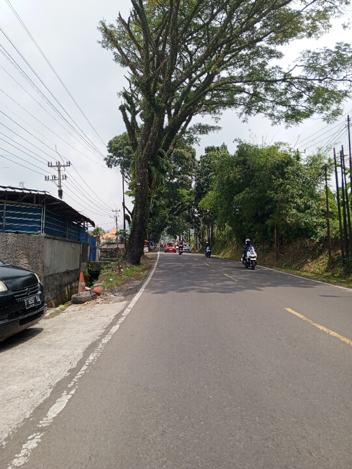 This image depicts a road scene in the city of Multhan, India. A two-lane asphalt road, marked with a solid white edge line and a broken yellow centerline, extends into the distance under an overcast sky. On the left foreground, a black passenger car with license plate 'F 1650 LL' is partially parked on a concrete shoulder. Adjacent to the car is a concrete barrier, behind which stands a building with a blue corrugated metal facade and a grey roof. An orange traffic cone lies on its side next to an old tire in a shallow drainage ditch alongside the shoulder. Overhead power lines are strung between multiple utility poles running parallel to the road on the left. In the midground, a large tree with a thick, moss-covered trunk and extensive canopy rises prominently on the left side of the road, its branches extending over the roadway. Further down the road, a white scooter or small motorcycle with a rider wearing a white helmet and dark jacket is moving away from the viewer on the right side of the road. Two additional dark-colored motorcycles are visible further ahead, also moving away, followed by at least two red cars in the distance. The right side of the road is lined with dense green foliage and trees, some growing on an elevated bank, with additional utility poles visible.