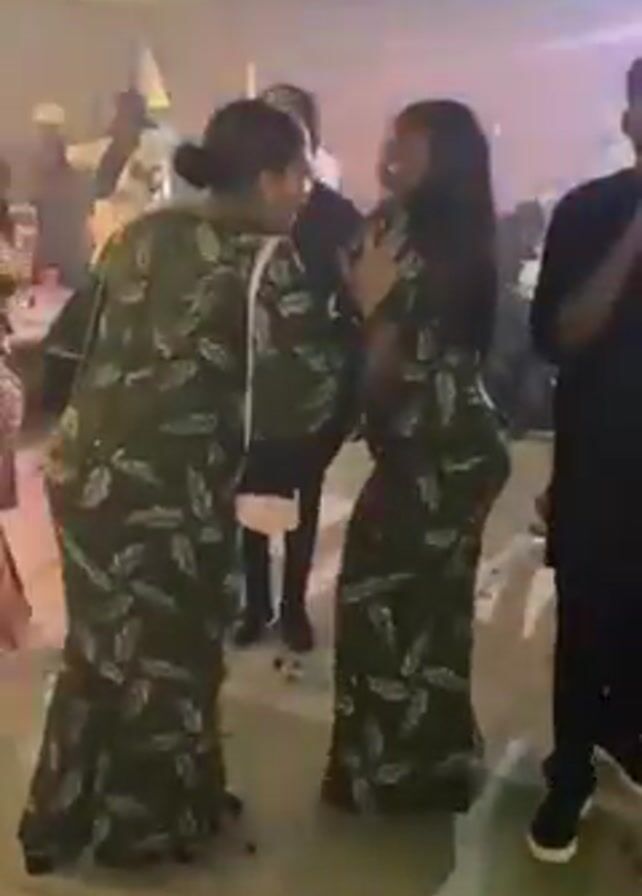 People dance at a gathering. Two women wearing leaf-patterned dresses dance face-to-face. A man in a black shirt and black pants steps in to dance with them. The dance floor is lit with a pale color, with other people standing or dancing in the background.