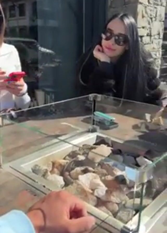 n outdoor cafe scene on a sunny day. It starts with a woman in sunglasses and a white jacket holding a red phone near a glass-covered decorative element on a table. The camera then pans to show other people at tables, including a couple and a man with sunglasses, all seemingly on their phones. The background features buildings with distinctive architectural styles, suggesting a resort town. The camera movement reveals more outdoor seating at the cafe and a street with pedestrians and cars.
